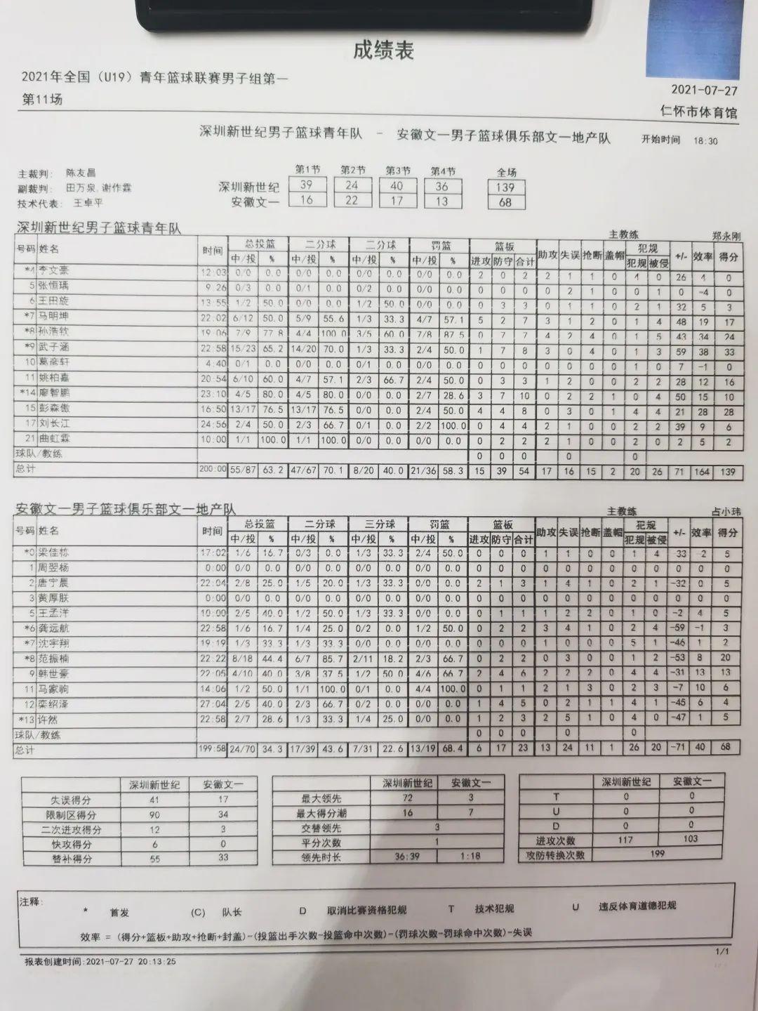 2021全国U19青年篮球联赛第一阶段进入到第三个比赛日,深圳新世纪迎来安徽文一的挑战。本场比赛,深圳队从开局就牢牢的占据着主动,首节就将分差拉开到23分。武子涵、彭森傲、孙浩钦三人合砍85分,最终深圳139:68大胜对手。