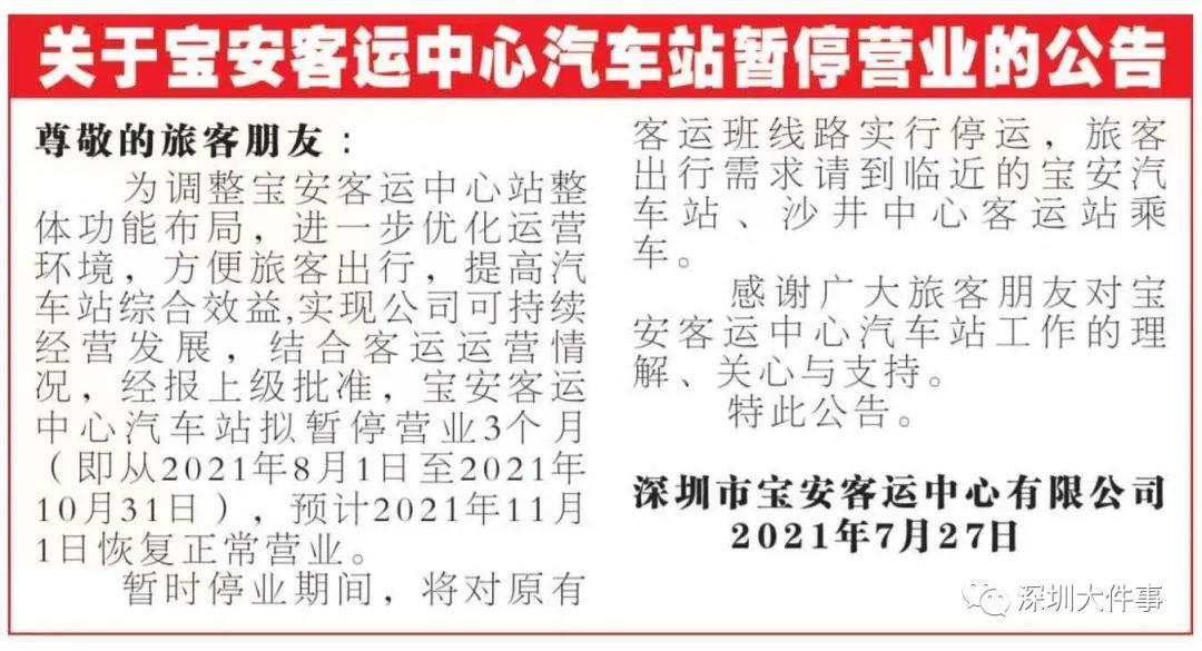 通知内容显示,由于受高铁、顺风车、产业转移以及新冠疫情的影响和打击,沙井汽车站经营形势不乐观,客源、营收断崖式下降,将于2021年8月1日起停止营业。