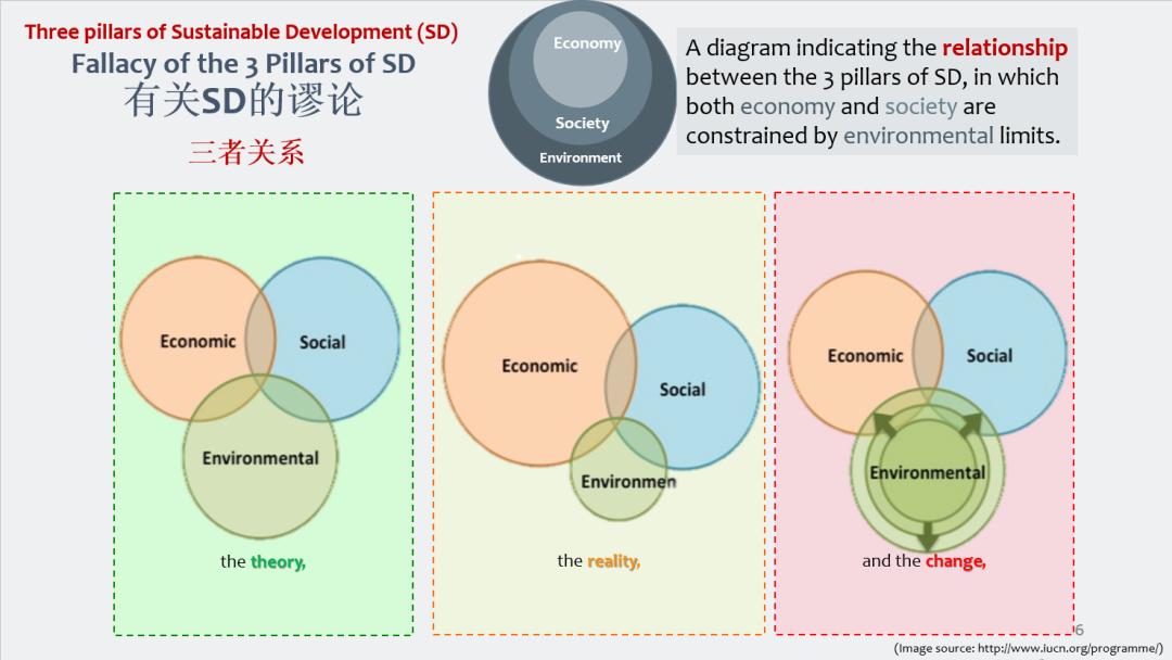 可持续发展的三大支柱:经济、社会、环境,以及对应三类实施主体即国家、社会学家、普通人在可持续发展20年进程中承担的角色功能。