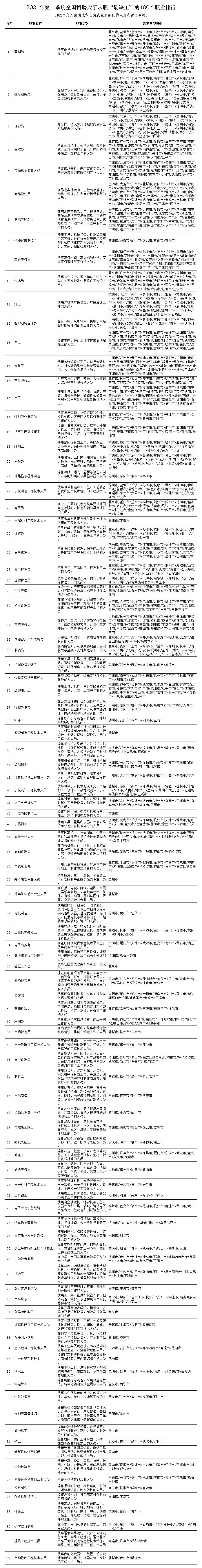 与2021年第一季度相比,排行“前十”职业略有变化,本期“市场营销专业人员”“商品营业员”“仪器仪表制造工”进入前十,“客户服务管理员”“汽车生产线操作工”“包装工”退出前十。
