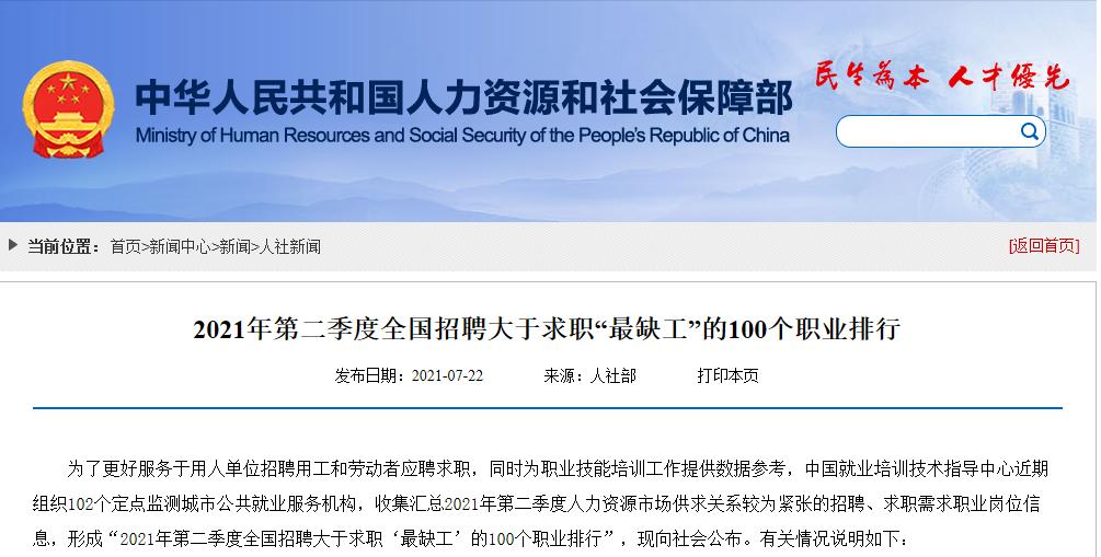 从“最缺工”的100个职业看,招聘需求人数从一季度的166.5万人减少至153.8万人(下降7.63%);求职人数从一季度的60.9万人减少至51.7万人(下降15.11%);缺口数从一季度105.5万人下降至102.1万人(下降3.22%);总体求人倍率(招聘需求人数与求职人数的比值)从一季度2.73上升至2.97(上升8.79%),市场总体供求关系仍偏紧。