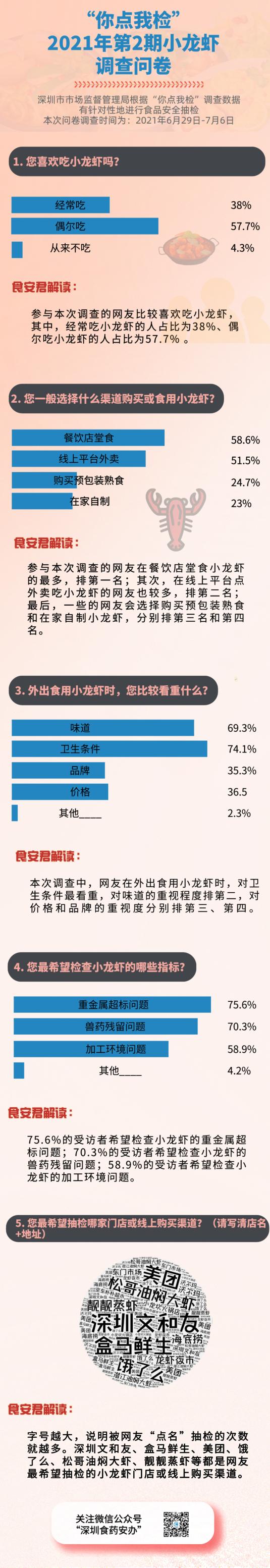 为进一步宣传食品安全知识,科学回应公众对食品安全的关切,获得消费者的认可,促进食品安全社会共建共治共享,根据《广东省市场监督管理局办公室转发市场监管总局办公厅关于做好食品安全“你点我检”服务工作指导意见的通知》(粤市监办发〔2020〕1274号)相关工作要求,深圳市市场监管局指导开展2021年“你点我检”活动,活动通过线上调查和线下执法相结合的形式开展。