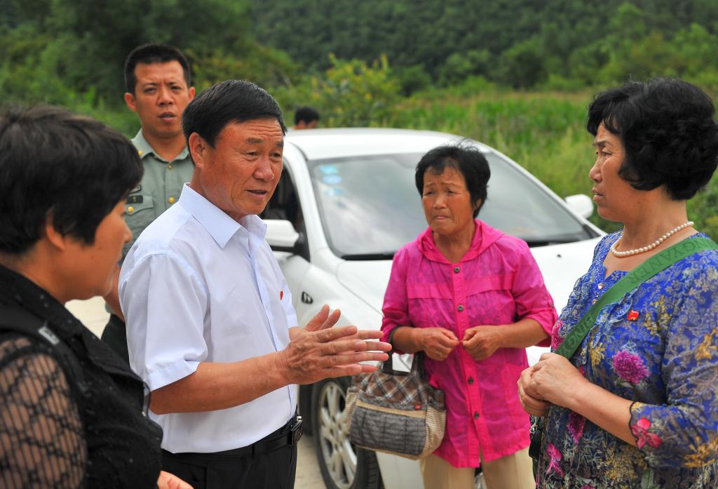 金春燮在与几名烈士家属交流(2015年8月12日摄)。新华社记者许畅摄