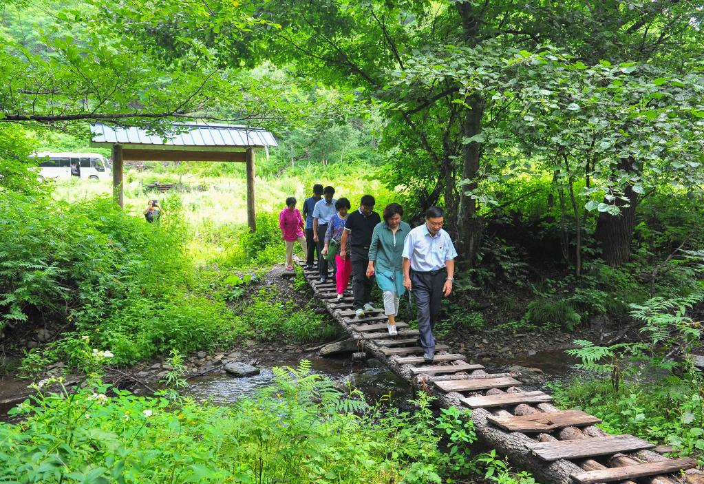 金春燮在踏访一处抗联密营时途经一处木桥(2015年8月12日摄)。新华社记者许畅摄