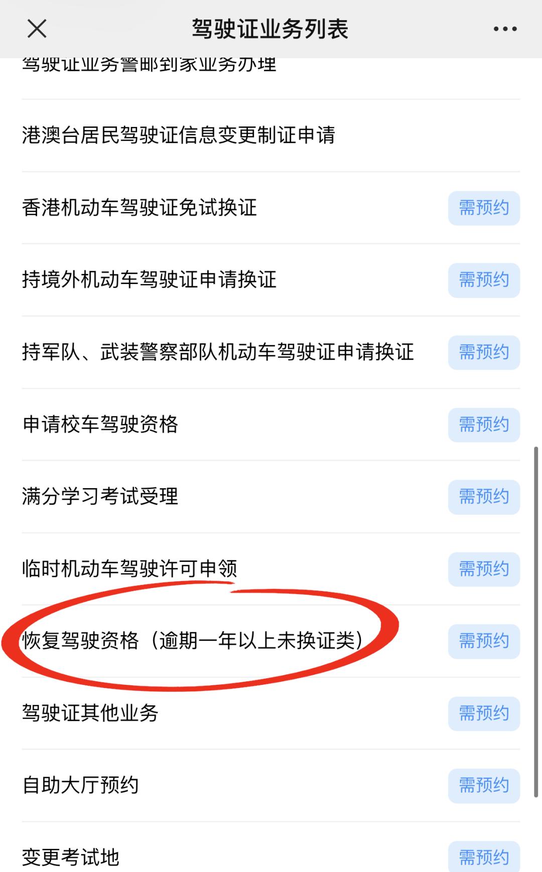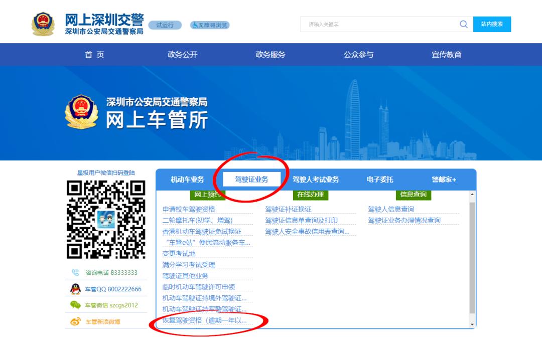 登录深圳交警网上车管所(http://szjj.sz.gov.cn/CGZL)→在驾驶证业务预约栏选择“恢复驾驶资格(逾期一年以上未换证类)”业务。