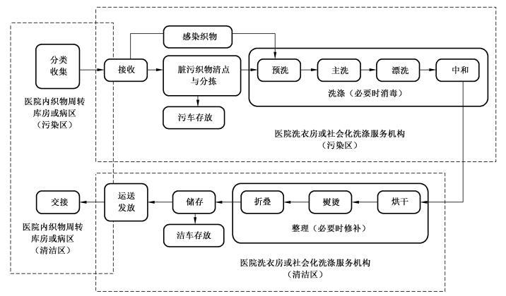 按照《医院医用织物洗涤消毒技术规范》(WS/T508-2016),对使用后的医用织物实施收集、分拣、消毒洗涤、整理,存储时应由污至洁,顺行通过,不应逆行。