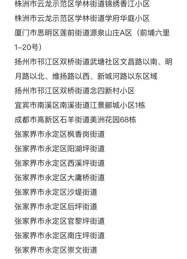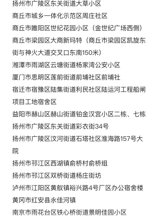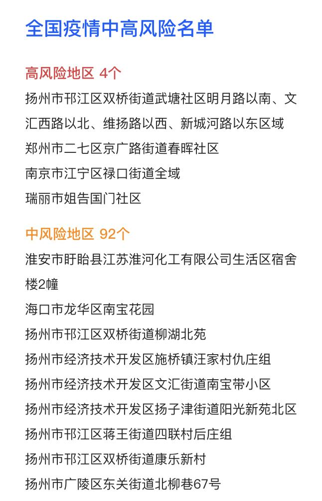 扬州市邗江区双桥街道武塘社区明月路以南、文汇西路以北、维扬路以西、新城河路以东区域由中风险地区调整为高风险地区;