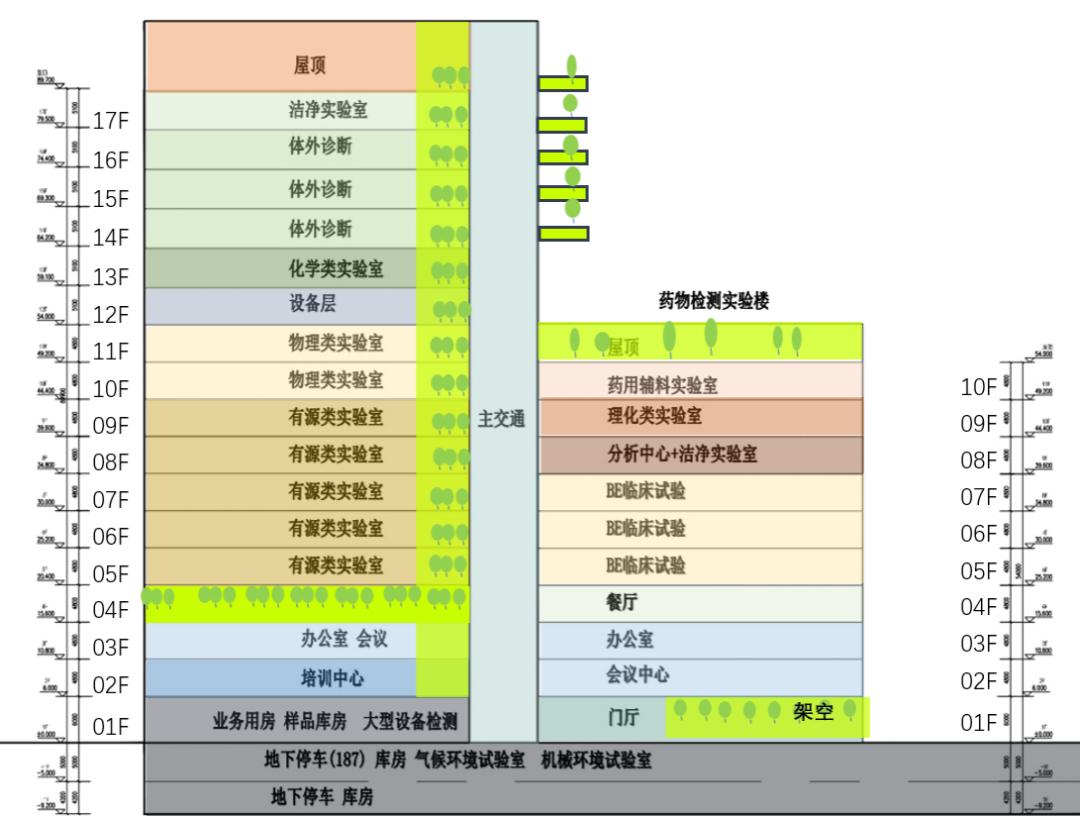 适合体量大的实验室建设布局,楼层功能布局较单走道更为完善,更符合本项目检验流程。