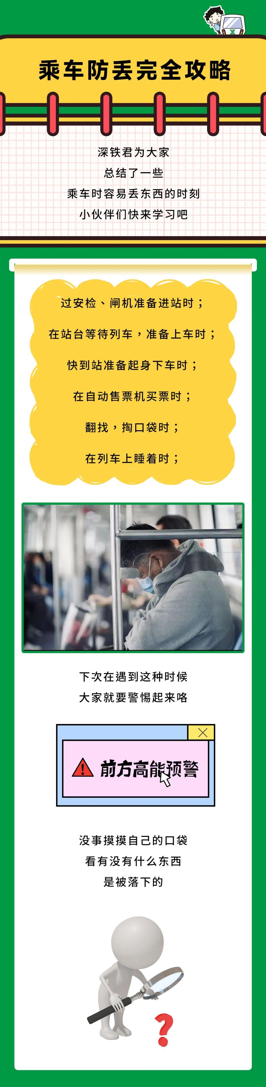 攻略在手坚决不丢#失物“后悔药”#每天地铁通勤的你总有马虎大意丢失物品的时候发现重要物品丢失时那可真是后悔死了所以大家乘车时一定要牢记这份地铁防丢攻略才能保障自己的财产物品安全哦//ShenzhenMetro//◆◆乘车防丢完全攻略◆◆有了这一份乘车防丢攻略是不是放心多了呢但深铁君还是要最后提醒不管在什么时候什么地方都要多留心随时注意自己的物品才是最重要的哦/·内容来源 深圳地铁·部分图片来源网络,如有侵权联系删除编辑 集团党群办公室本文由深圳地铁整理编辑发布,转载请注明来源·在看的,麻烦点一下再走▽