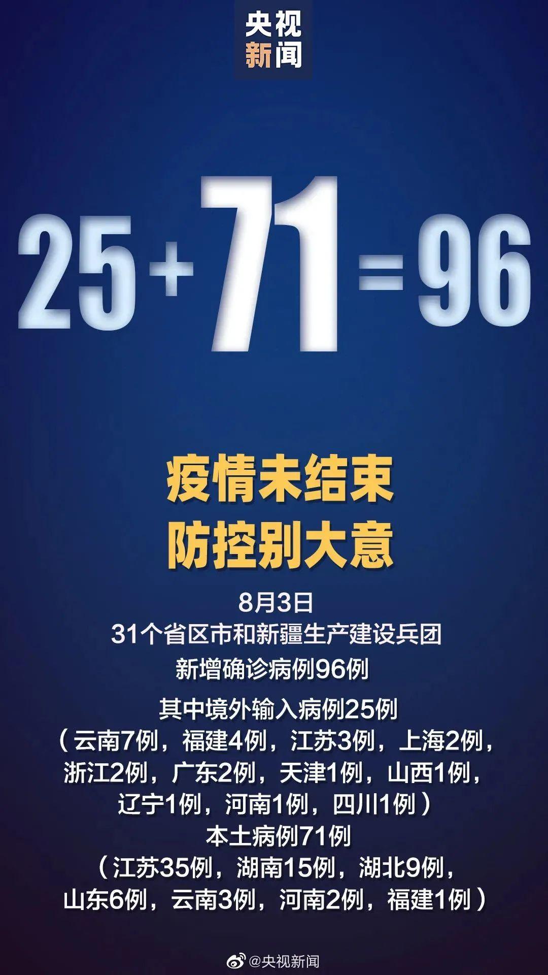 国家卫健委今天(8月4日)通报,8月3日0时至24时,31个省(自治区、直辖市)和新疆生产建设兵团报告新增确诊病例96例,其中本土病例71例(江苏35例,湖南15例,湖北9例,山东6例,云南3例,河南2例,福建1例);新增无症状感染者27例,其中本土15例(河南9例,湖北3例,湖南3例)。