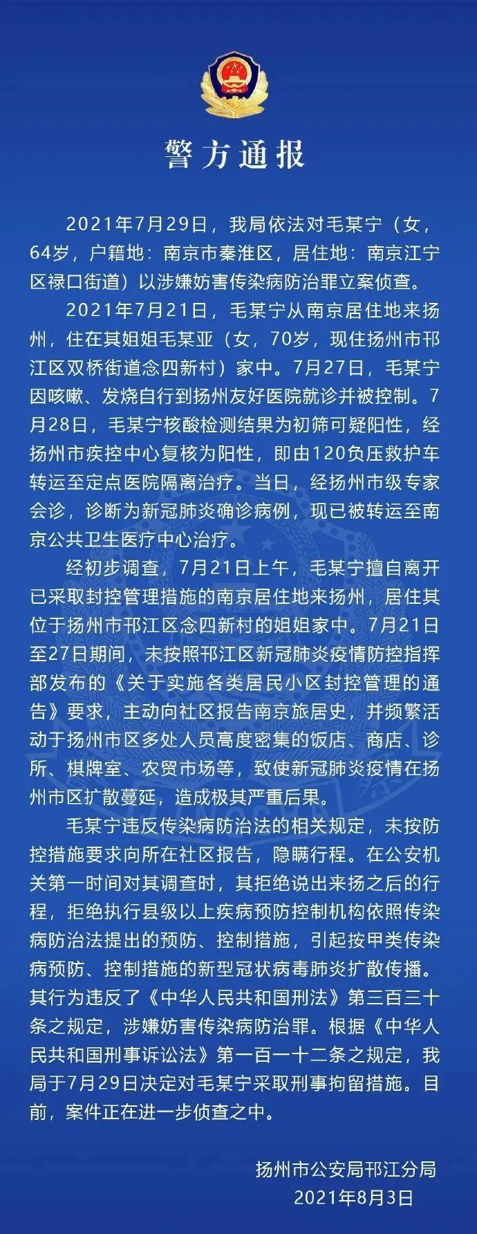 2021年7月29日,扬州市公安部门已对毛某宁(女,64岁)以涉嫌妨害传染病防治罪立案侦查。因系新冠肺炎确诊病例,根据统一安排,毛某宁被转运至南京定点医院治疗。目前,案件正在进一步侦查之中。