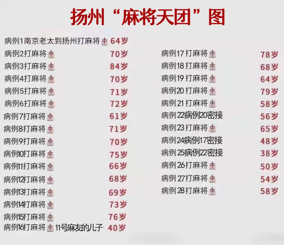 记者梳理发现,在8月2日之前的病例活动轨迹显示,扬州确诊病例以老年人为主,他们主要是棋牌室出入、逗留人员。而棋牌室、麻将馆等这类场所,空间狭小、相对密闭,空气质量相对较差,存在极大的传染风险,让当地的防控形势愈发严峻复杂。
