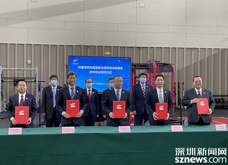 在当天举行的深圳龙岗国家冰球项目训练基地签约授牌仪式上,体育总局冬运中心常务副主任、党委副书记丁东,广东省体育局副局长杨海,深圳市文化广电旅游体育局巡视员韩星元,深圳市龙岗区文化广电旅游体育局局长朱玉华,北京冬奥会冰球项目备战领导小组副组长、昆仑鸿星创始人岳欣禹共同签署了《关于共建深圳龙岗国家冰球项目训练基地合作协议》。五方协议的签署也宣布国家冰球项目训练基地落地深圳龙岗。