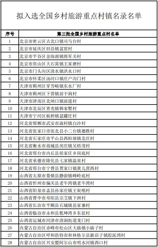 拟入选第三批全国乡村旅游重点村名单和第一批全国乡村旅游重点镇(乡)名单如下。