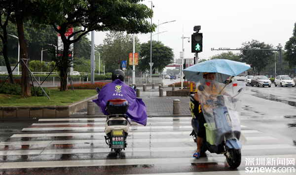 下雨天,不少骑着电动车出行的市民都披上了雨衣。