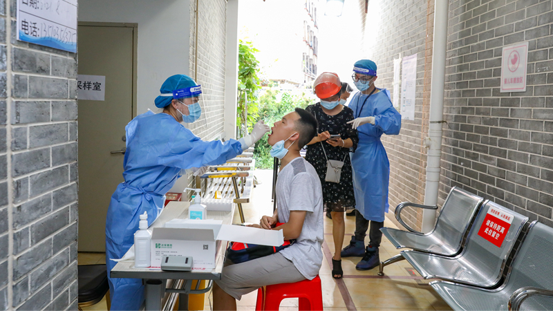8月3日下午,前来检测的市民逐渐多了起来,他们在医护人员的指引下,依次进行核酸检测。“取下口罩、张开嘴,头轻轻往后仰,放轻松……”在采样台,负责采集咽拭子的医务人员对每位受检者不厌其烦地重复着同一句话。“我们分组上岗,各负其责,现场开单、采集、核对、统计等,每项工作都有条不紊地开展着。采样人员采取轮换方式开展工作,一批人员撤下休息后立即换另一批上。核酸检测是控制疫情的关键环节。为了能在最短时间内完成检测,核酸检测医务人员不分昼夜,力争在最短时间内让核酸检测出结果。”燕川社康主任刘中峰介绍。