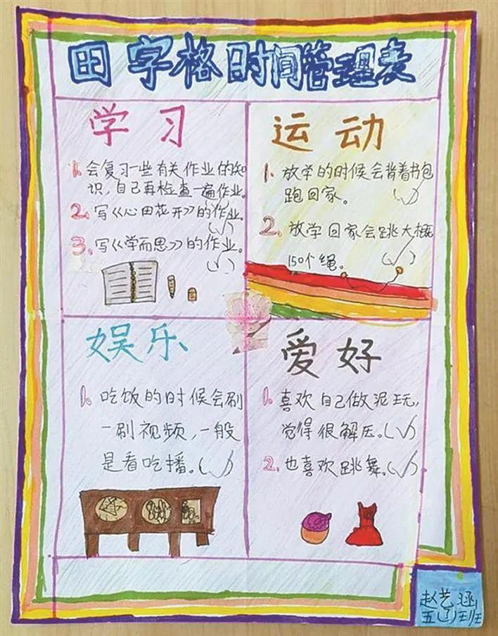家长都知道要让孩子养成制定计划的习惯,但很多都流于形式,不如换一个办法,让孩子制定“田字格”。孩子完成每天的课后服务回到家,家长可以在白纸上画一个大大的田字格,然后分别在四个格子里写上“学习”“运动”“娱乐”“爱好”等小项目,作为当晚时间管理的类别。当然,如果你家孩子喜欢的不止这几个类别,还可以画上九宫格。