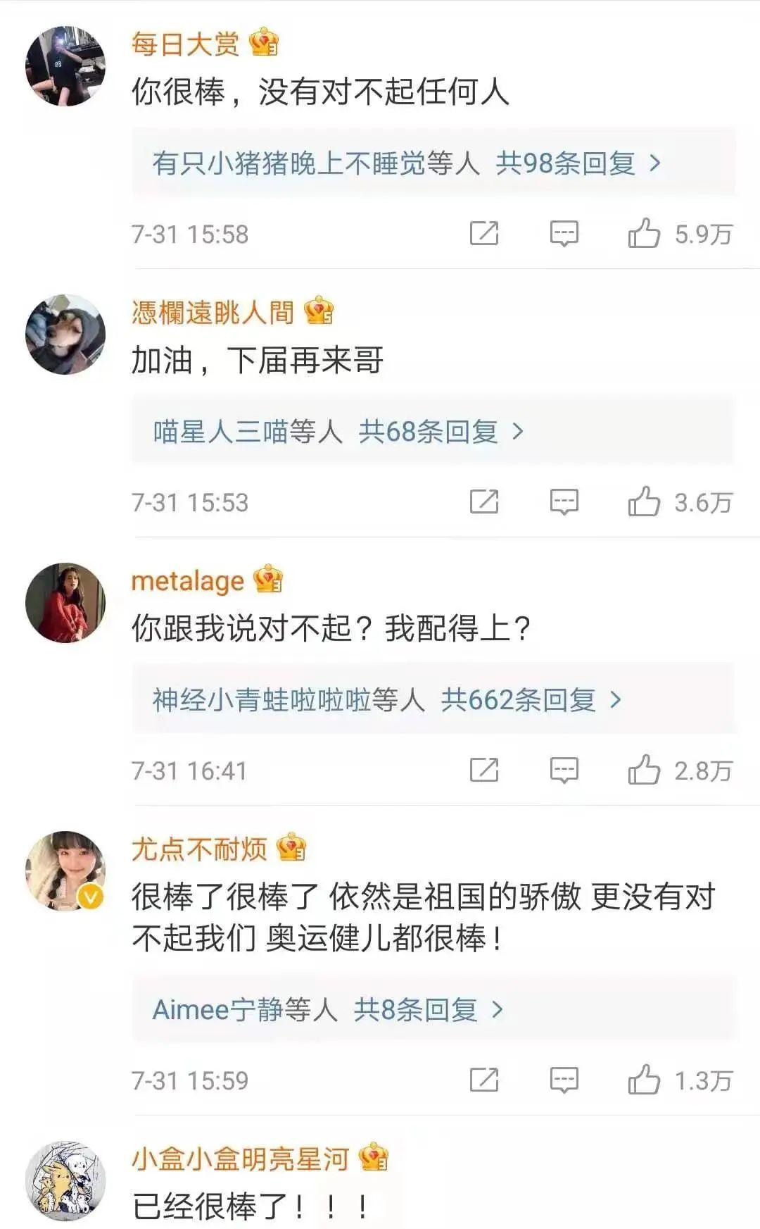 无论是哭着说“对不起大家”的刘诗雯,还是发博说“对不起祖国人民”的李佳伦,都得到了网友温暖的回应。