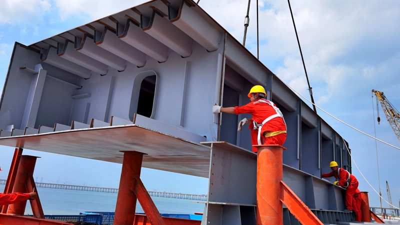 据现场副经理张会静介绍,该标段于2020年11月正式开工,计划2022年6月完成第一施工区段建成,时间紧,任务重。且全标段为海上作业,海事、边防、公安、城管共同配合施工,海上深水围堰施工难度高,交叉施工作业多,为快速推进工程建设,中铁大桥局项目部精心组织,超前谋划,坚持稳中求快,安全、快速、高效的推进关键线路钢箱梁基础及下部结构施工,确保此次首节段钢梁如期顺利架设。