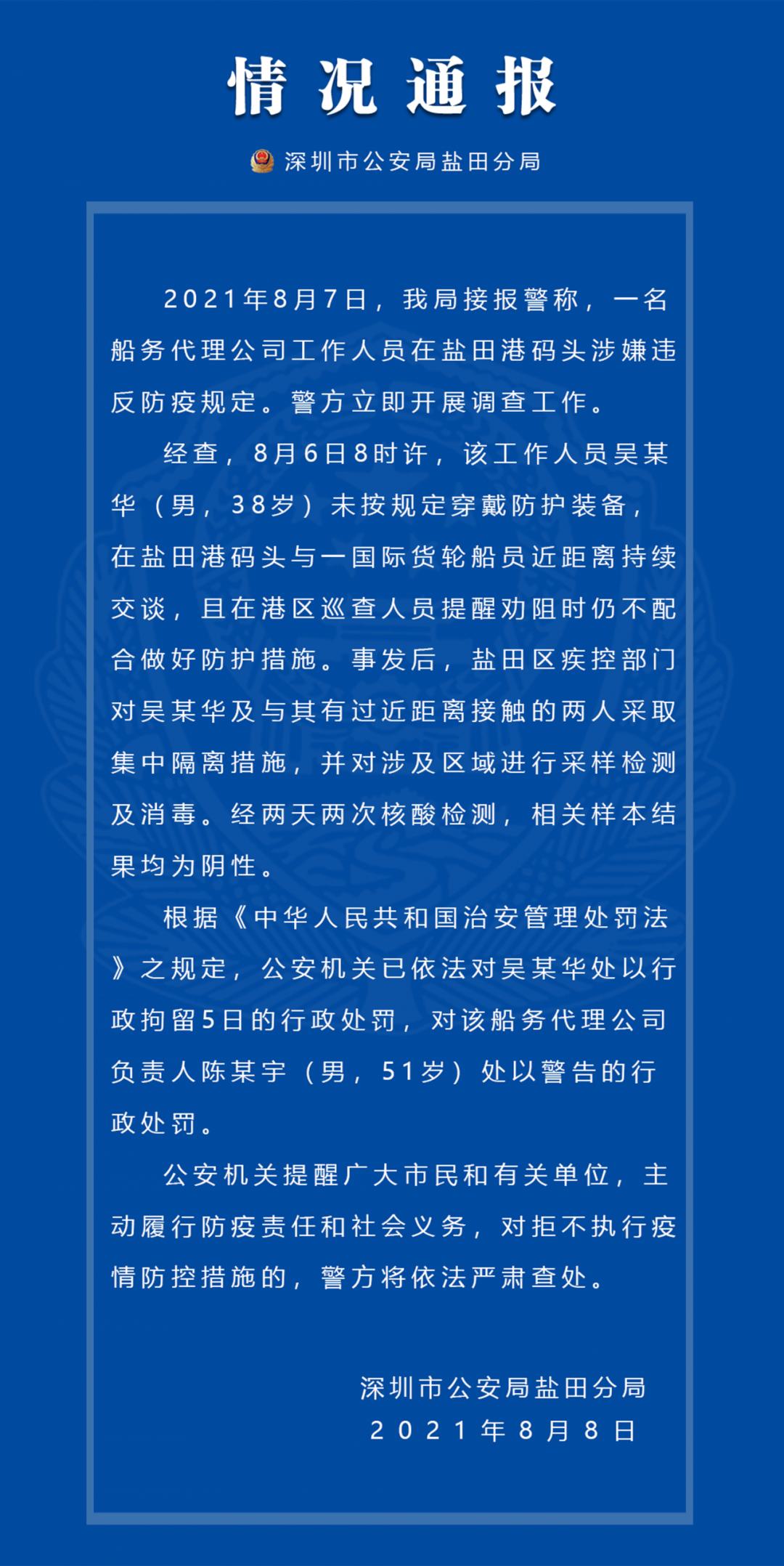 深夜通报!深圳盐田港一男子违反防疫规定,致两人被隔离!警方:拘了