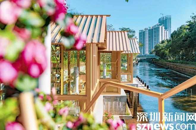 新建后的盐田河公园,打通原有的疏朗空间,因地制宜种植了大腹木棉、红花玉蕊、黄花风铃木等开花乔木植物,为盐田河沿线增添一抹浪漫色彩,使之成为一个集生态环保、观赏游玩、休闲运动的综合性滨水海绵公园。在公园绿地改造过程中,盐田区城市管理与综合执法局坚持贯彻海绵设施设计理念,合理运用设置下沉绿地、雨水花园、生态树池、采用透水材质铺装、调整微地形等海绵措施,将景观和生态有机结合起来,以景观与城市的良性融合,构建生态优先的盐田公园体系。遇见图书馆就位于盐田河公园连心桥旁边,原木结构和玻璃的设计,与公园的环境融为一体,相得益彰,大面积的玻璃窗让整座图书馆变得透亮。