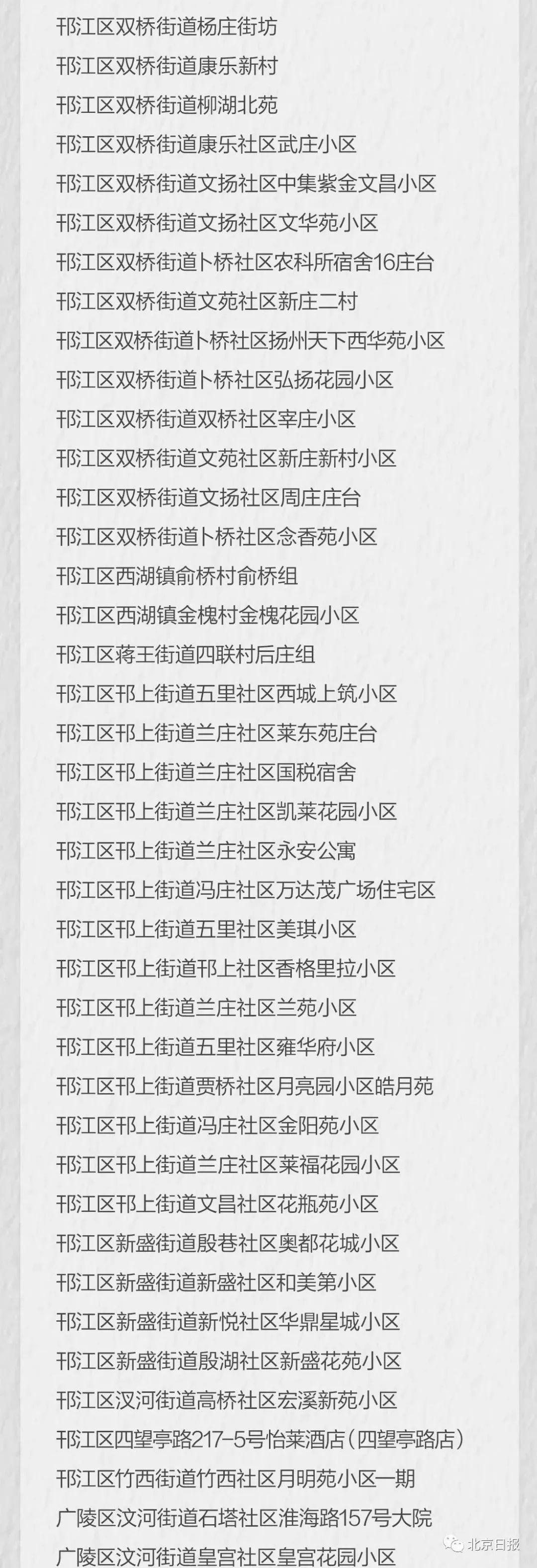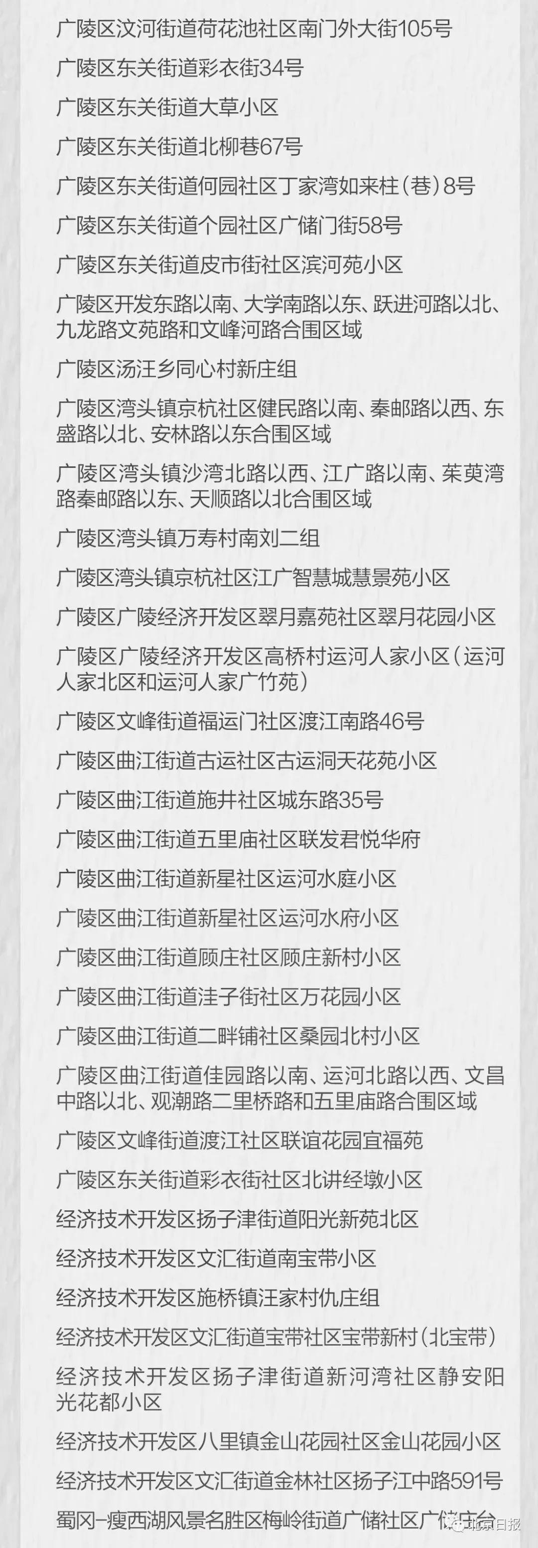 扬州市广陵区湾头镇沙湾北路以西、江广路以南、茱萸湾路秦邮路以东、天顺路以北合围区域(原中风险地区广陵区湾头镇万福社区广福花园小区并入);