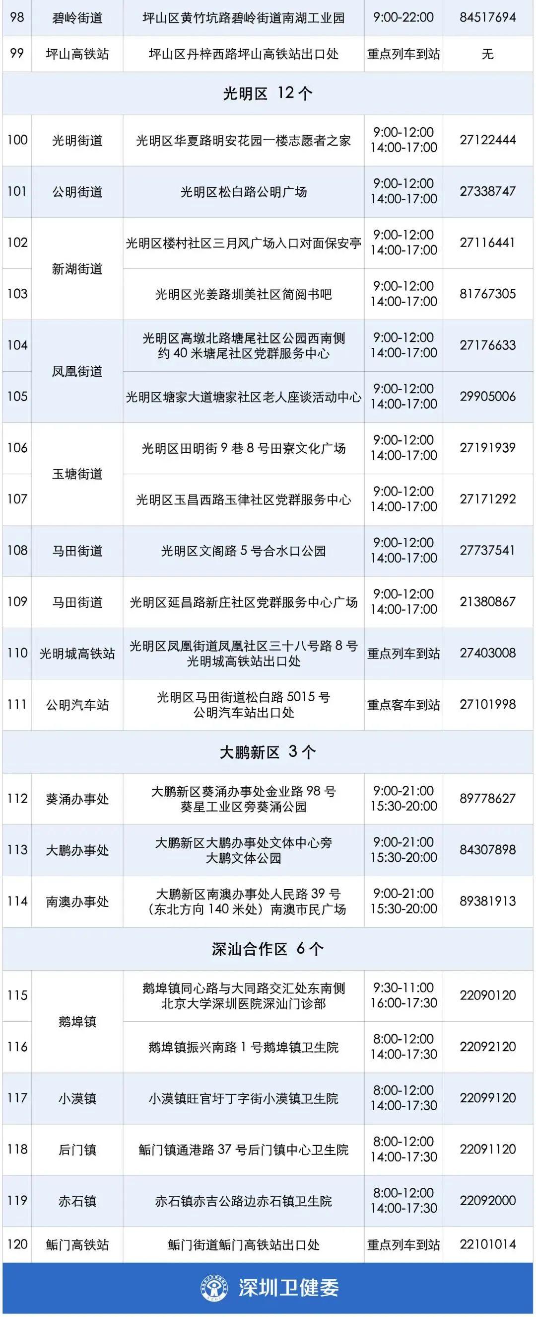 在各区、新区、合作区设立120个免费核酸采样点,为所有外地来深人员及其他有需求人员提供免费采样核酸检测服务。