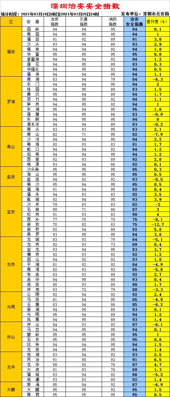 为进一步优化指数发布工作,使指数既反映区域治安安全现状,又体现阶段变化,从2020年第1期开始,指数名称更改为深圳治安安全指数,并按照递远递减每期不同权重原则,计算出每个区域的阶段提升度,一并予以发布。