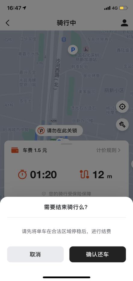 还车时,定位系统将结合用户位置和车辆位置判断市民还车位置是否为文明停车区域,若为文明停车区域则下发关锁指令