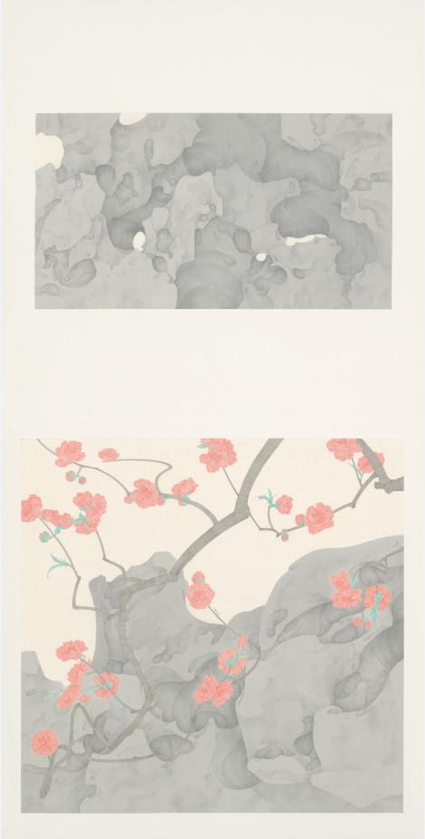 张见,花石册之一,绢本设色,24.4×44.6cm ,47×47.6cm,2021