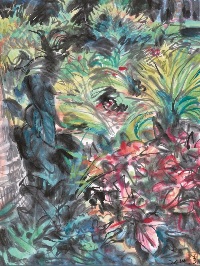 常青,花草丛中之一,水墨粉彩,45× 34cm,2020