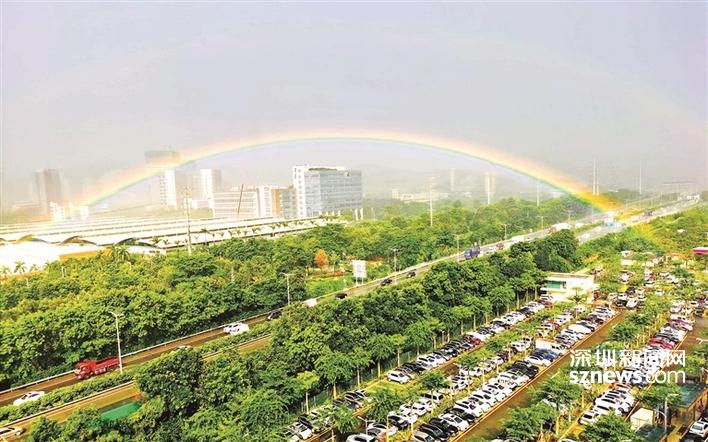 读特客户端·深圳新闻网2021年8月16日讯(宝安日报记者 雷云霞/文 通讯员 蔡欢 李世界/图)8月15日,光明虹桥上空出现了一道彩虹,地面上的虹桥加上天空中的彩虹形成了一道“双虹桥”,与此同时,在凤凰街道塘家社区上空还出现了双彩虹,很快光明市民的朋友圈就被彩虹刷屏了。