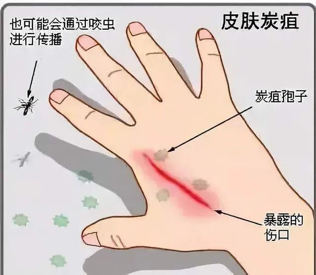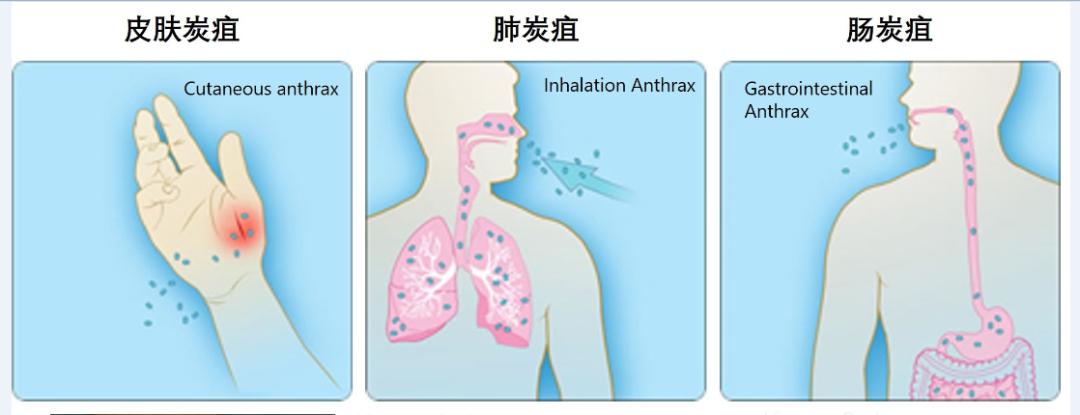如果皮肤暴露于这些污染源,炭疽杆菌会通过皮肤上的微小伤口进入人体并引发皮肤炭疽,而如果食用了受污染的肉类,则可以导致肠炭疽,患病的牛、马、羊等食草动物的分泌物、排泄物、皮毛含有细菌,形成气溶胶,飞沫或粉尘后,人吸入可引起肺炭疽。肺炭疽也可继发于皮肤炭疽而引起。