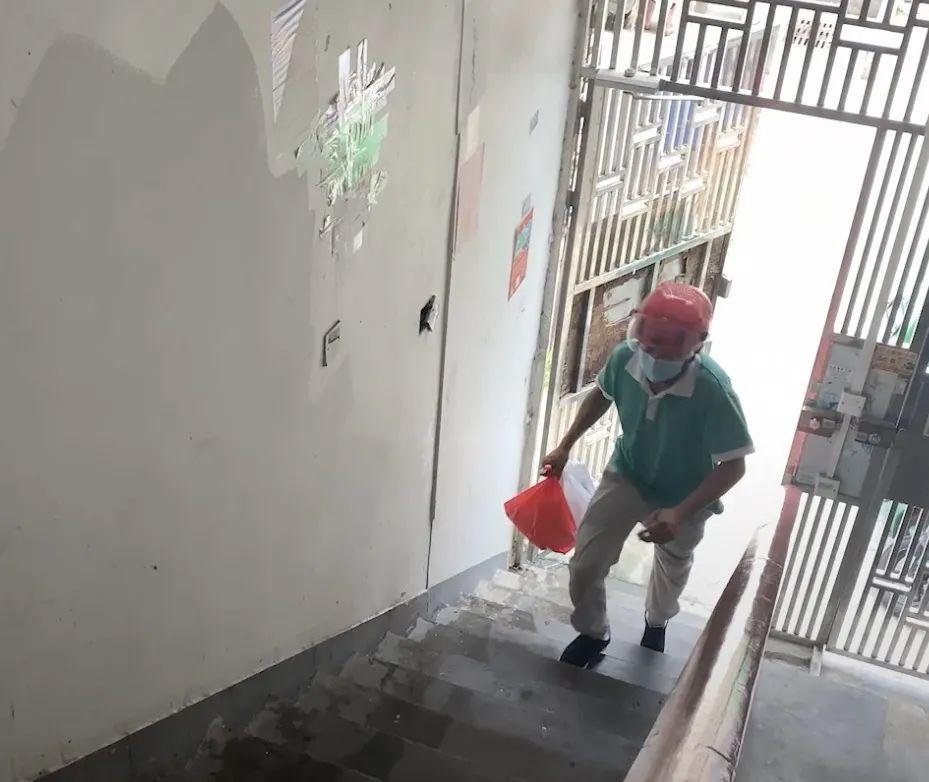 有一次,我脖子上挂着菜、手上抱着油和水,肩上还扛着一袋米,摇摇晃晃、非常吃力地爬了七楼。这天气实在是太热了,我甚至有点喘不过气来。但当听到顾客对我说辛苦了时,我就觉得很宽慰。