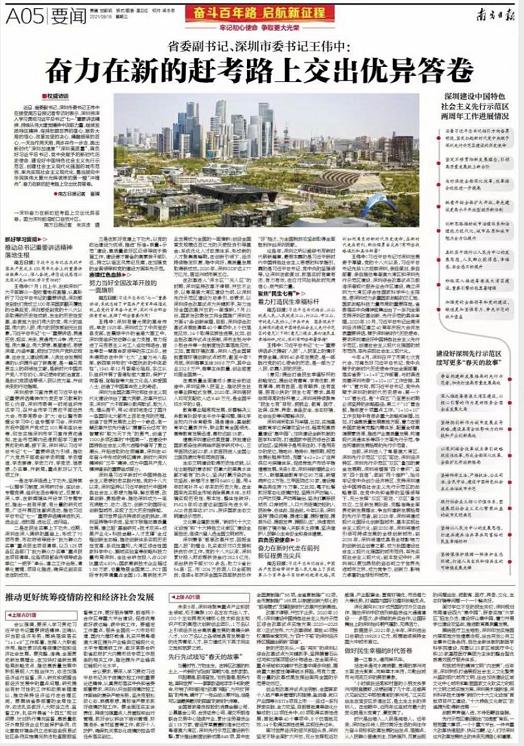近日,省委副书记、深圳市委书记王伟中在接受南方日报记者专访时表示,深圳将深入学习贯彻习近平总书记“七一”重要讲话精神,持续从伟大建党精神中汲取力量,继续发扬特区精神,保持放眼世界的雄心、服务大局的恒心、改革攻坚的决心、精雕细琢的匠心,一天当作两天用、两步并作一步走,跑出新时代“深圳加速度”“深圳高质量”,肩负好习近平总书记、党中央赋予的新时代历史使命,建设好中国特色社会主义先行示范区,创建社会主义现代化强国的城市范例,率先实现社会主义现代化,勇当驶向中华民族伟大复兴光辉彼岸的第一艘“冲锋舟”,奋力在新的赶考路上交出优异答卷。