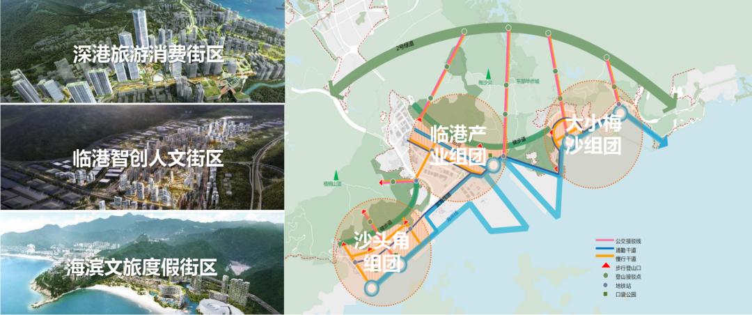 并通过识别沙头角、临港产业、大小梅沙三大组团特色,构筑深港旅游、临港智创、海滨文旅三大主题街区。