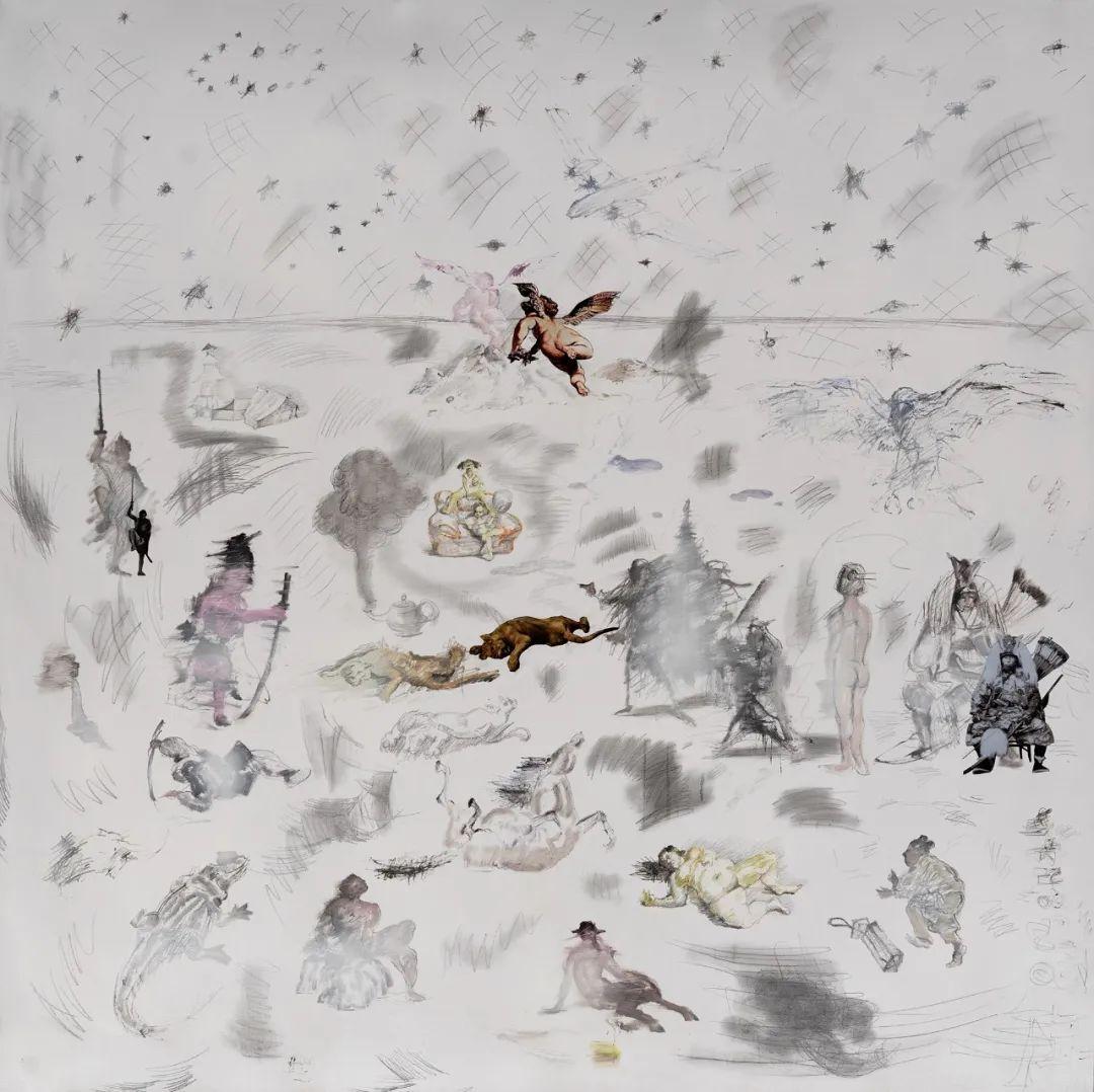 Ma Bing, In the boundless dusk, Heraclitus Aristotle Plato and Leucippus wandered aimlessly, none of them could see each other, Oil on Canvas, 200x200 cm, 2020