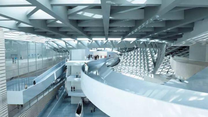 这里有通向博物馆各个垂直空间的竖向交通,包括电梯、自动扶梯、楼梯,还有从公共广场过渡到博物馆空间(或者说是从博物馆空间过渡到公共广场)的坡道,这些不同的垂直交通可以让游客从不同的角度观赏这个建筑体。