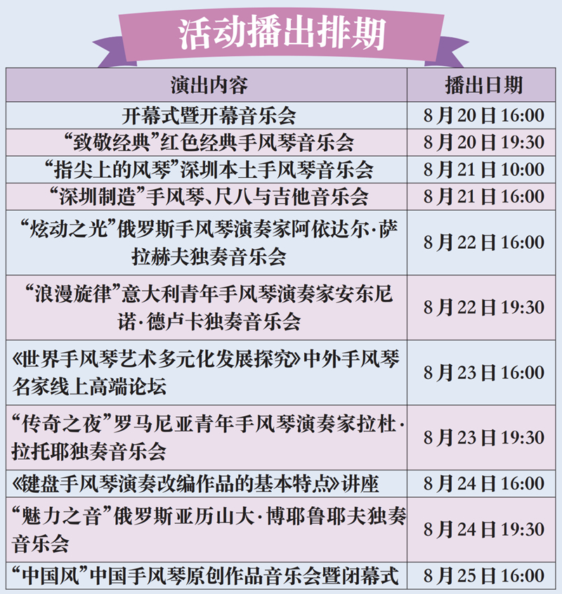 记者了解到,受疫情影响,本届手风琴艺术周推出形式上采用线上直播和录播相结合的方式,市民朋友们可通过“新浪直播”和“深圳市手风琴协会”微信公众号观看活动直播。
