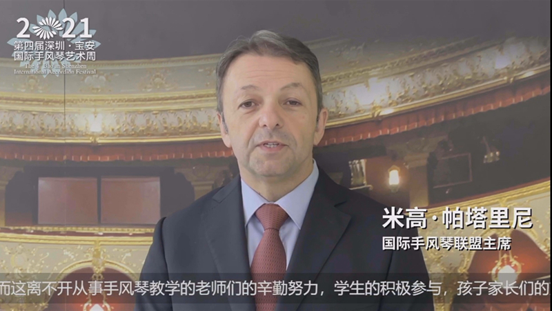 开幕式音乐会上,中国音乐家协会手风琴学会会长李聪,国际手风琴联盟主席米高·帕塔里尼、秘书长基莫·马蒂拉、大使凯文·弗莱德里奇、艺术委员会主席谢里瓦诺夫、公共关系部部长哈里·琼斯等国内外领导嘉宾先后通过视频向手风琴艺术周的顺利开幕送上诚挚的祝福,寄语各项活动取得圆满成功。