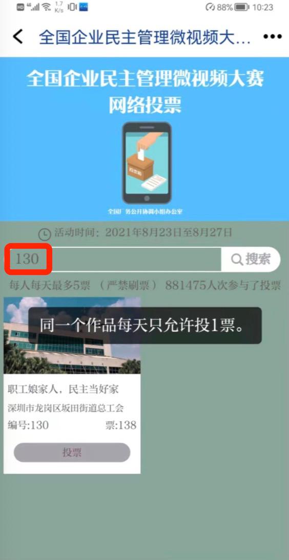 第三步:在活动版面内搜索参赛单位名称“坂田街道总工会”、作品名称“职工娘家人,民主当好家”的关键字或直接输入130即可进行投票。