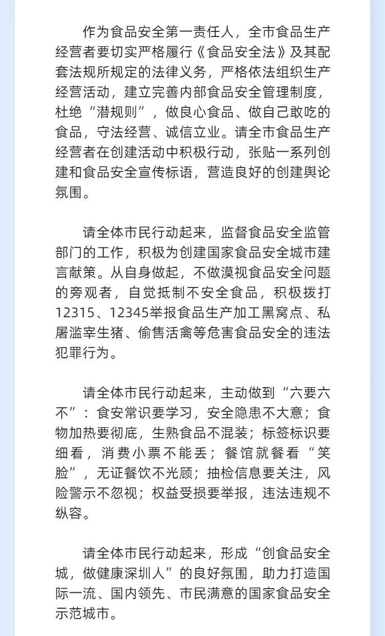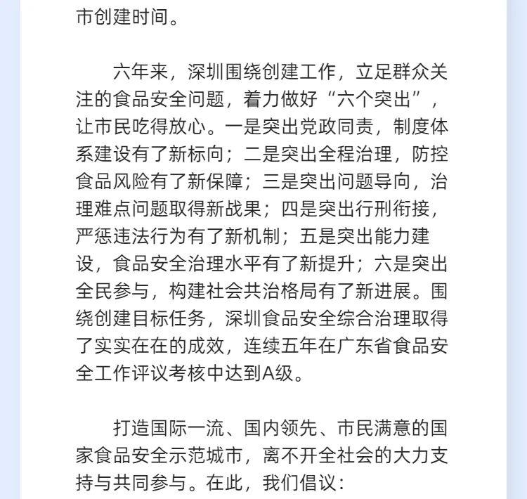 深圳市全力筑牢食品安全防线,监管力求全覆盖,标准引领大湾区,努力形成多元共治、全民食安意识提升的社会格局,实现“打造国内领先、国际一流、市民满意的国家食品安全示范城市”。面对国家的检查,对食品安全是否满意,对创建工作是否了解,是创建工作重要考核项!