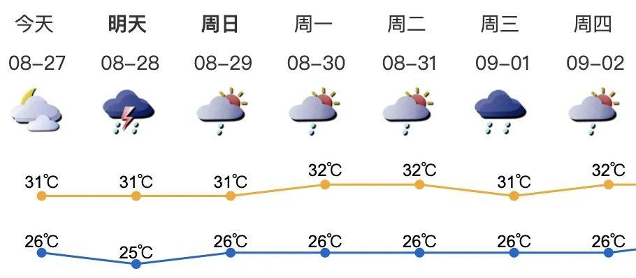 我市(含深汕)27日多云间阴天,有雷阵雨,局部大雨到暴雨,雨时伴7-8级短时大风,高温天气短暂缓解;28-9月2日大致多云,间中有阵雨,天气持续炎热。