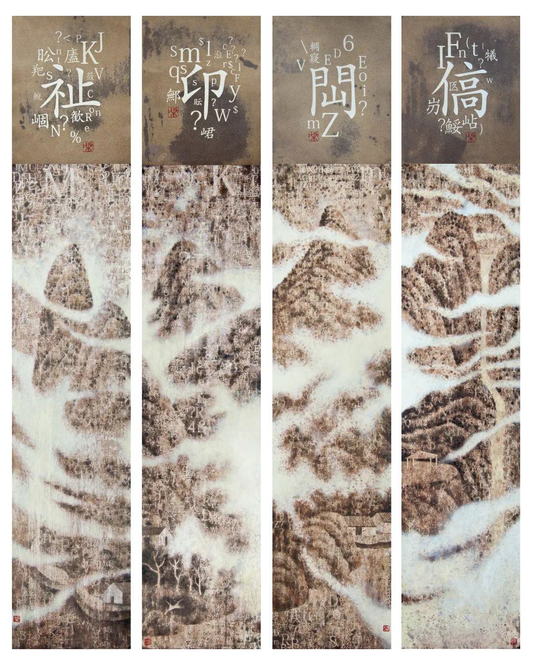蒋乃骏,高山仰止,纸本油彩,157x29.5 cmx4,2017