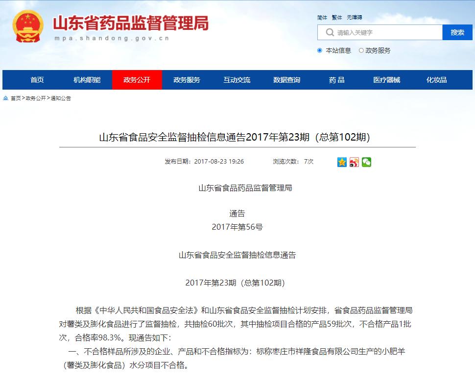 2017年8月23日,山东省食品药品监督管理局发布的2017年第23期食品安全监督抽检信息通告,枣庄市祥隆食品有限公司生产的膨化食品,水分不合格。