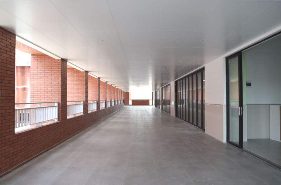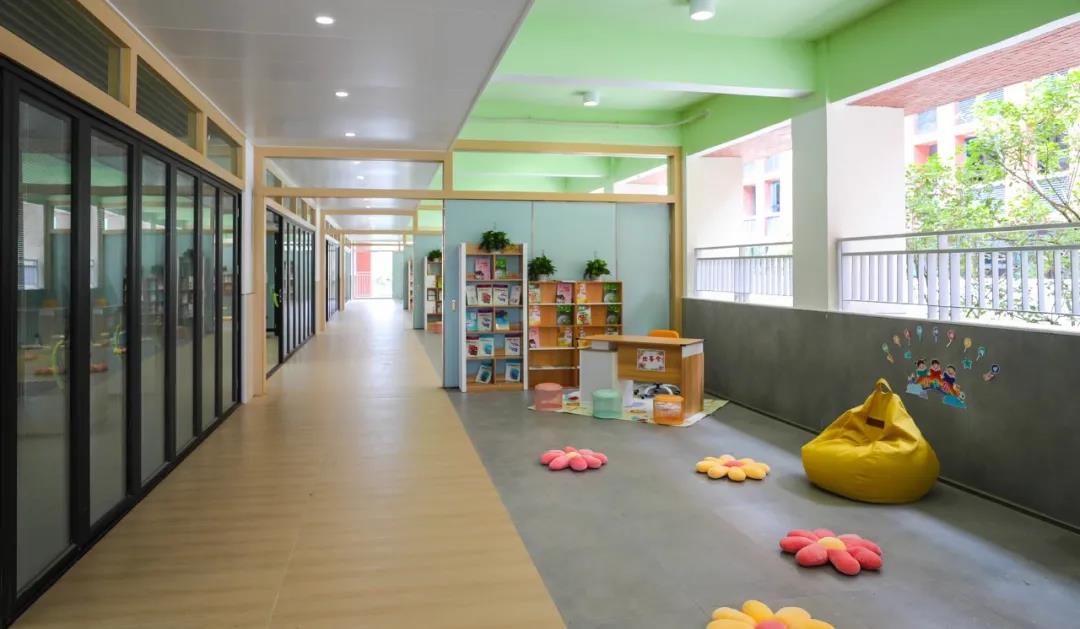 宽阔的连廊突破了传统的通道概念,设置有流动图书馆、情感交流角、口语交流角、小组讨论角、活动角,学生可以在不同楼层、不同角落找到多层次、个性化的学习空间。小学部部分楼层采用“两房一厅”的空间布局方式,通过加宽走廊和活动隔断实现教室与走廊的空间连通,将走廊空间纳入“泛教室”空间。