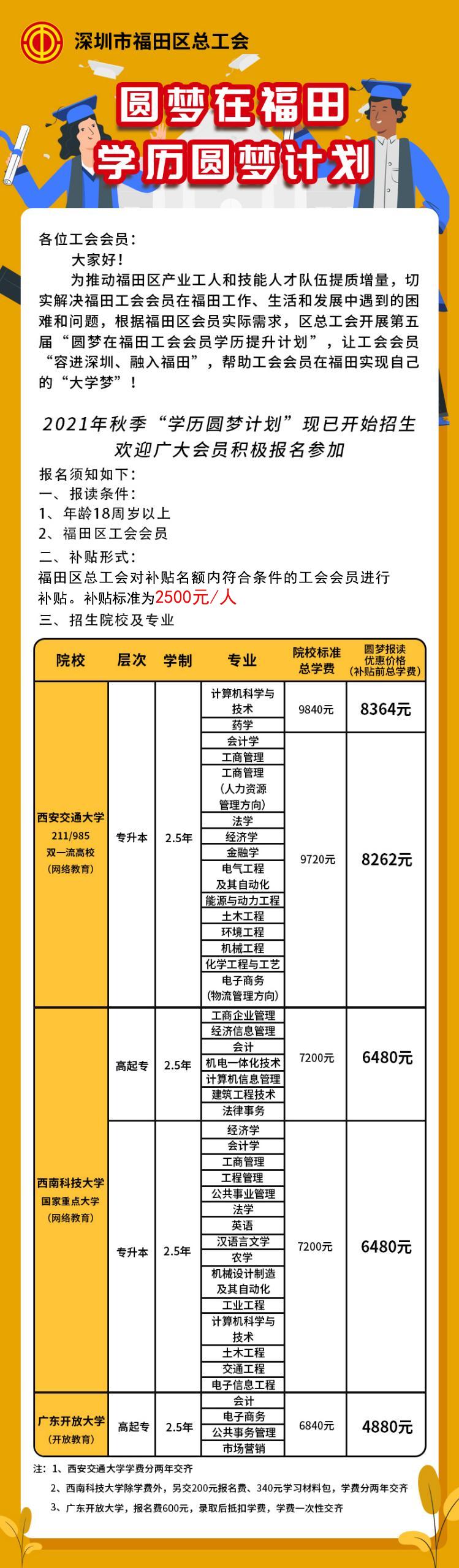 本期福田区总工会圆梦计划,招生院校有985、211、双一流名校西安交通大学,国家重点大学西南科技大学,可免试入学的广东开放大学。