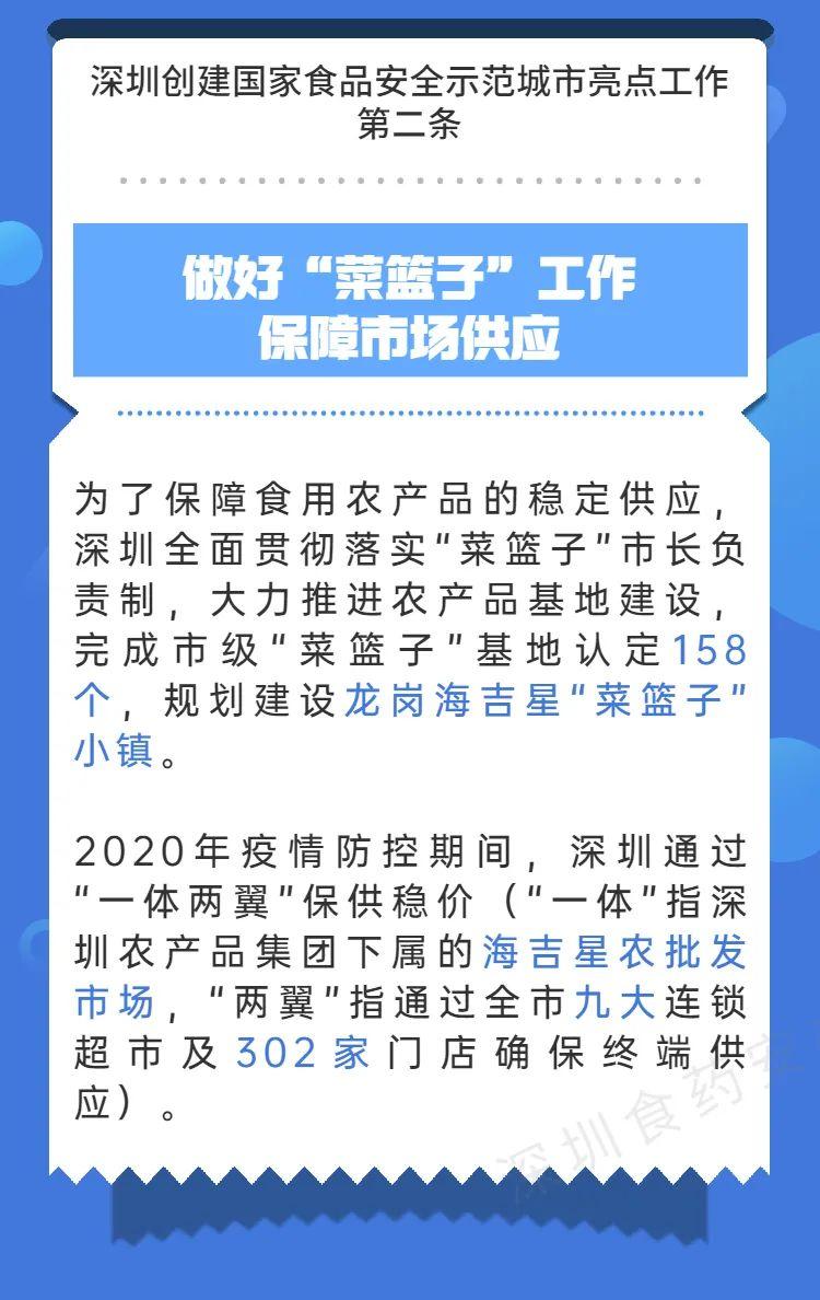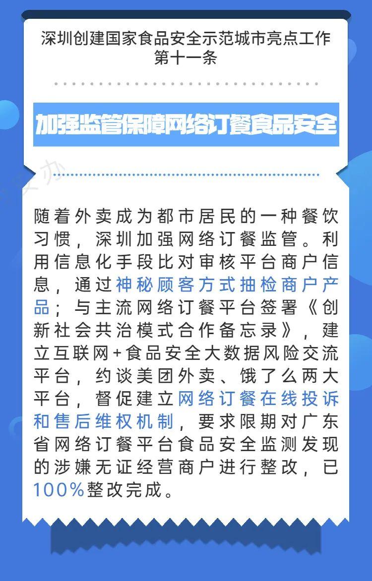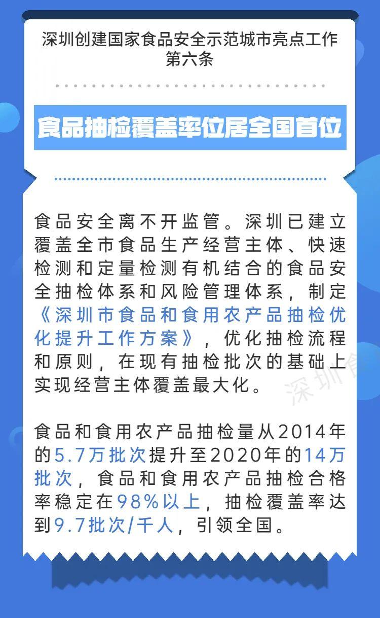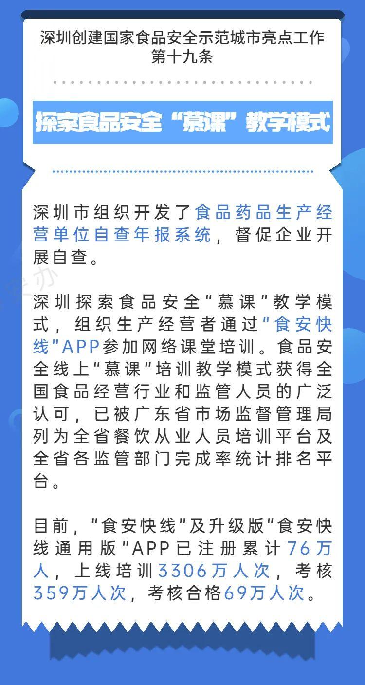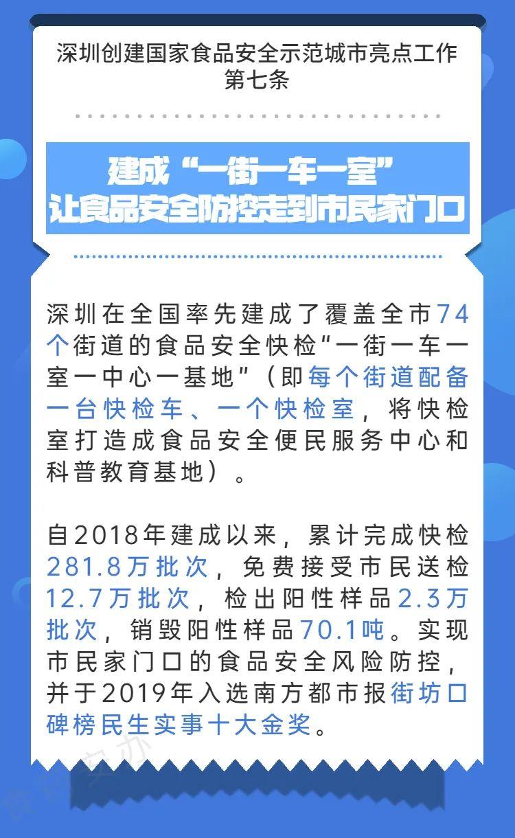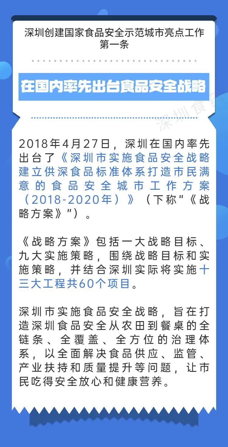 深圳市全力筑牢食品安全防线,监管力求全覆盖,标准引领大湾区,努力形成多元共治、全民食安意识提升的社会格局,实现“打造国内领先、国际一流、市民满意的国家食品安全示范城市”。面对国家的检查,对食品安全是否满意,对创建工作是否了解,是创建工作重要考核项!