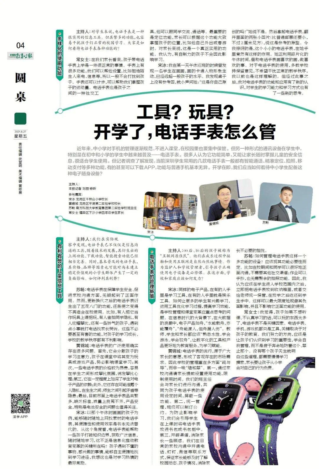 黄锦城:电话手表的流行,源于广大家长的意愿,形成了客观存在的巿场需求。因此学校的管理重在多方面“疏与导”,而非一味“堵和禁”。第一,通过家校沟通请家长提前设置使用功能,限制使用时间。我们的班主任会与家长们进行沟通,共同为孩子电话手表的使用设定时间,屏蔽一些功能。第二,统一管理,班级可以制订公约。为防止影响学习,我们会引导学生在上课时将电话手表放进书包或书包柜中。第三,开辟渠道,消除家长一些顾虑。我们在日常的家校沟通中开通电话、钉钉、微信等联系方式,保证家长能够及时了解校园动态、孩子情况,消除家长不必要的担忧。