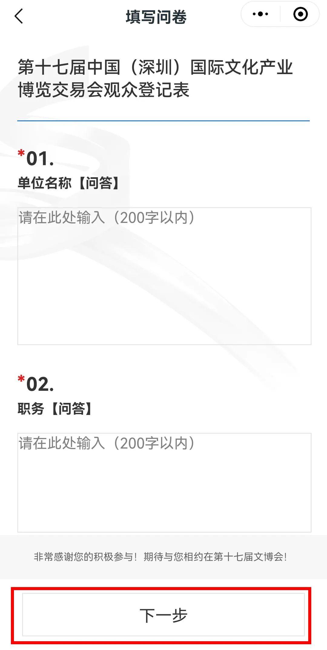根据实际填写问卷(其中带*为必填项),点击【下一步】;